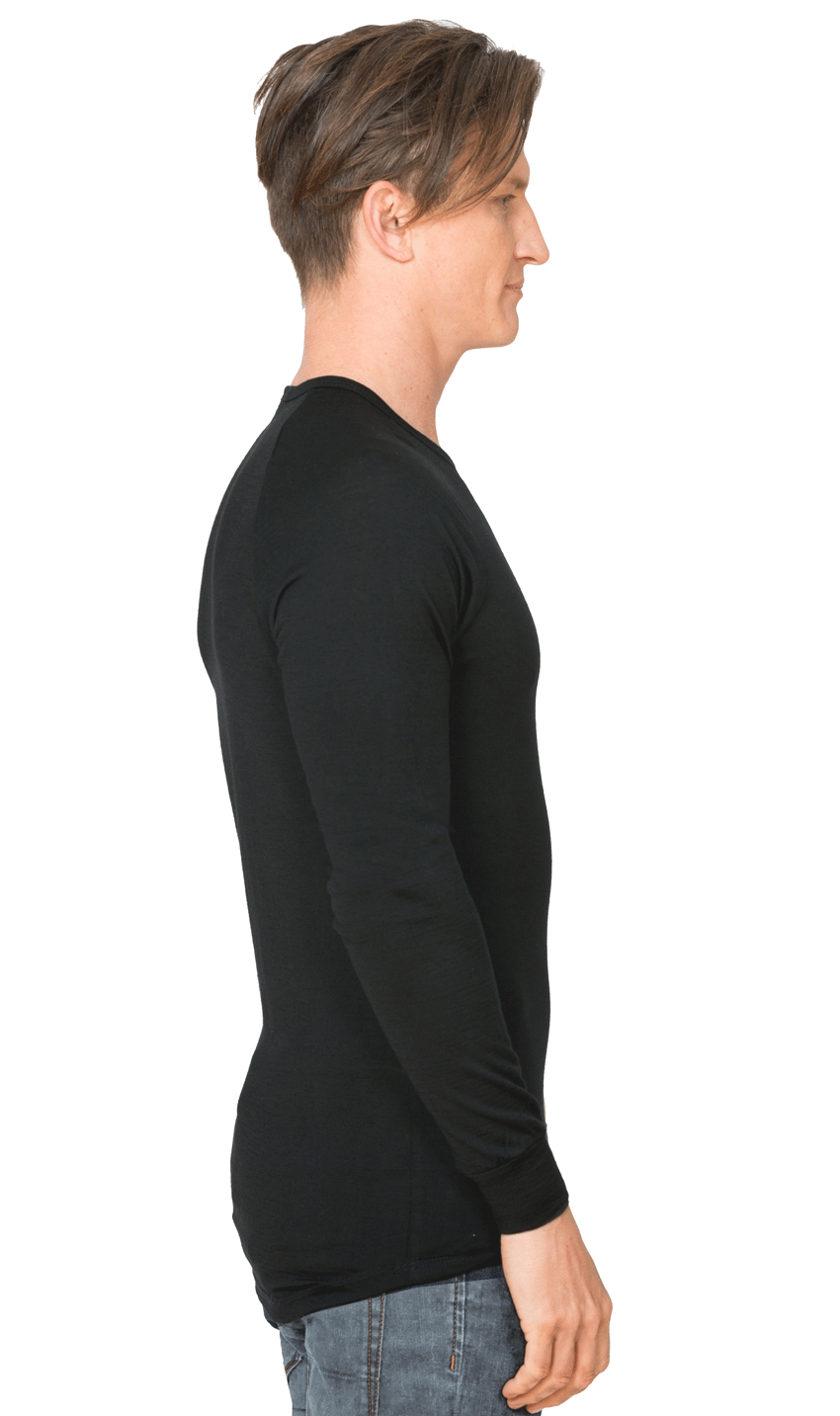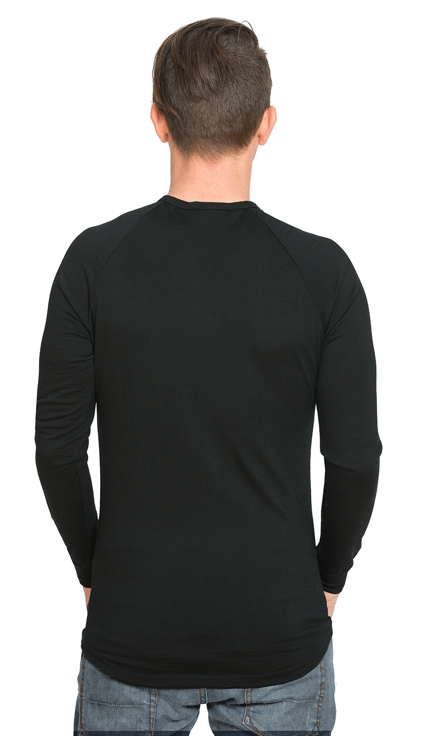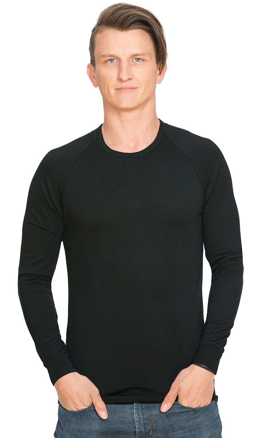 Crew neck, raglan sleeve with a shaped tail to tuck in for extra warmth.